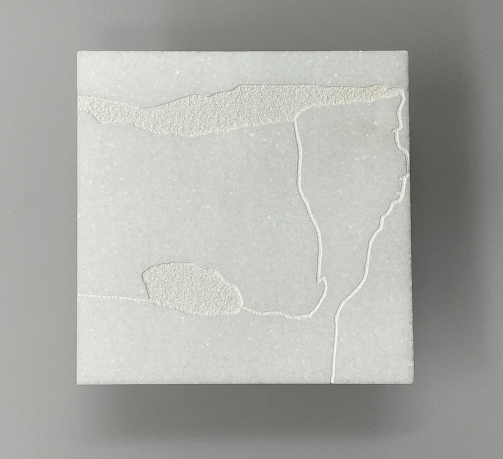 The drawings are engraved into the surface using laser radiation. The marble tiles are white marble from China. The tiles measure 9 cm by 9 cm and are 1 cm thick.